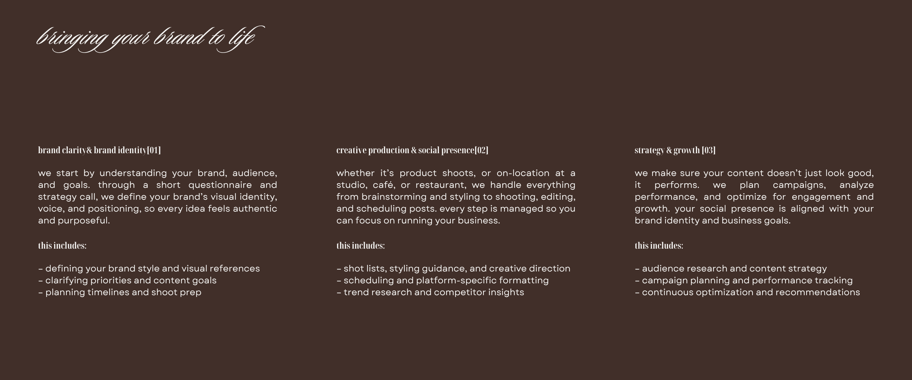 behind every scroll-stopping concept and strategy is our creative touch. we make brands show up in a way that feels elevated, effortless, and true to their identity. get to know the mind behind it all — the ideas, the strategy, and the aesthetic that make your brand stand out.
